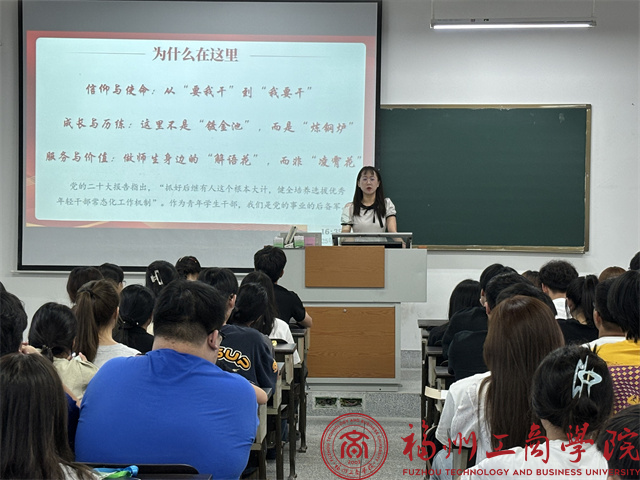 随后,团委书记何奕婷以“做一名优秀的学生干部”为主题,紧扣“青春领航 责任同行,凝聚青年力量 服务学生工作”的核心,从“为什么在这里”展开多维度剖析,并在服务与价值层面,提出要做师生的“解语花”而非“凌霄花”,需摒弃虚荣心,专注于理解和倾听师生真实需求,通过实际案例,系统讲解学生干部应如何提升组织、沟通、协作与领导能力,不断强化责任担当意识。同时,要明确“服务者+引领者”的双重角色,在推进团学工作与服务同学的过程中促进自身成长